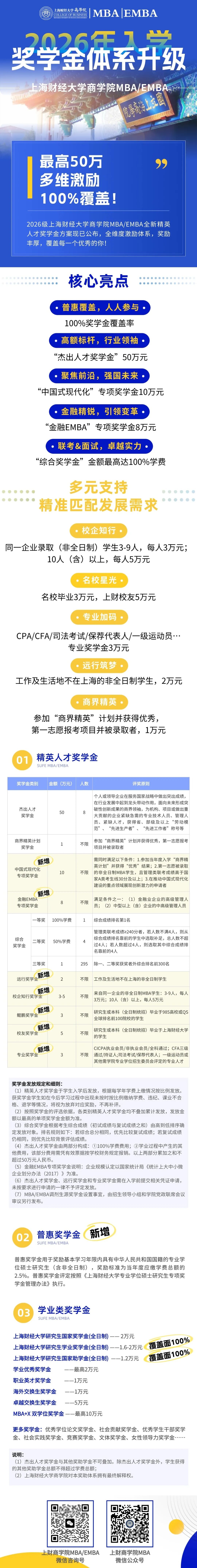 【上财MBA奖学金】再升级!报考必看!最高50万+****覆盖,全员普惠+多维激励,2026级上财商学院MBA/EMBA奖学金全面升级